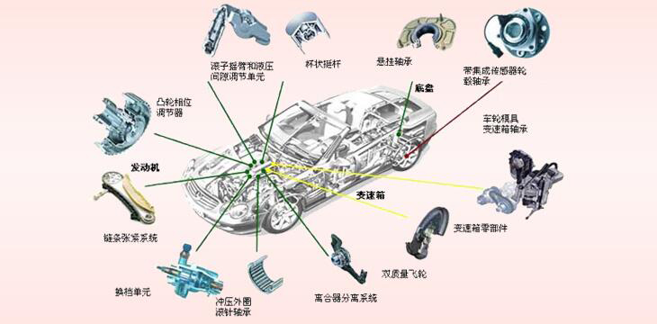 轎車上使用軸承的零部件總成件有:發(fā)動機(jī)、發(fā)電機(jī)、水泵、離合器、變速器、差速器、轉(zhuǎn)向器、空調(diào)機(jī)等。軸承類型主要是小型深溝球軸承、圓錐滾子軸承、圓柱滾子軸承、角接觸球軸承和滾針軸承等。配套的各類型軸承比例為:深溝球軸承占27%,圓錐軸承23%,滾針軸承15%,水泵軸承6%,圓柱滾子軸承5%,其他軸承24%。
